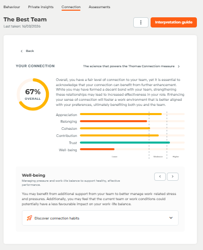 To delve into an employee’s sense of connection to a specific team, invite them to complete and share their Connection insights with you to support more purposeful conversations. If they are open to sharing, follow the steps in this guide to help them feel comfortable and at ease discussing their personal connection experiences.