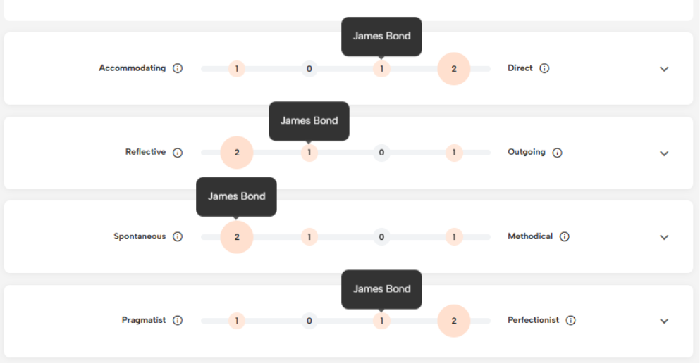 To learn more about the similarities between team member profiles, select the drop-down arrow on the right-hand side of each scale to uncover where each team member’s results are in relation to the team profile. Hover over a team member’s name in the ‘Team members’ section to see where exactly their preferences are within the overall team profile. The names of team members with similar profiles are grouped together for each factor.