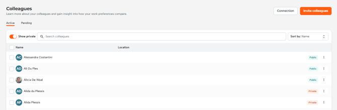 From the "Colleagues" section, select or search a colleague from the list. Only colleagues who have completed and shared their Behaviour insights will be available for you to view. See the ‘Public’ or ‘Private’ tag next to their name in the list. Colleagues who have not opted to share their insights will have a ‘Private’ tag.