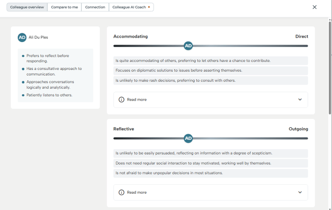 By clicking on a colleague’s name, you can view their Behaviour insights in the 'Colleague overview' section. Click 'Read more' for more detailed insights into their work and communication style. You can also view their insights alongside your own, by selecting the 'Compare to me' tab.