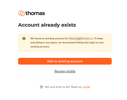 After signing in with your SSO provider, you will see a screen titled “Account already exists”. This means we have detected an existing Thomas account for your email address, and we want to link your SSO to it.