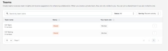 - Shared teams: Shared teams create a visible team space on the platform where all team members can access and experience their team insights, creating a shared identity. Team members can view the group they belong to.