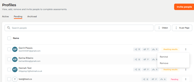 To solve this, click on the ellipsis to send a reminder to the person. They will either be asked to create their profile or nudged to complete the assigned assessments.