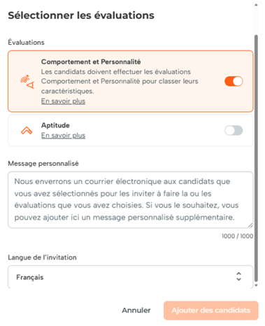 Choisissez les évaluations que vous souhaitez leur faire passer.