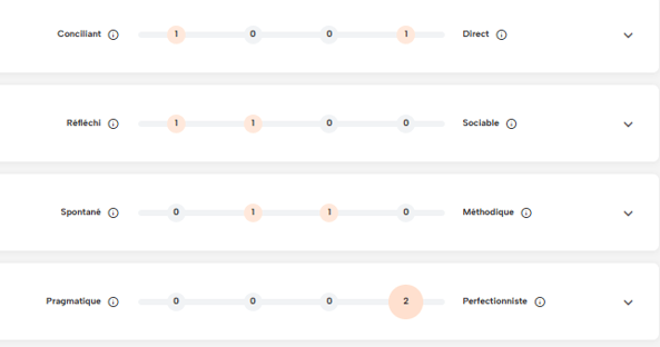 - L'équipe est chargée de fournir un travail d'une grande précision à l'échelle de l'entreprise. Elle consulte le profil de l'équipe pour identifier quel membre serait idéal pour documenter les contrôles qualité avant de rendre leur travail. Elle peut envisager une personne ayant une forte préférence pour le perfectionnisme, car celle-ci aura un grand souci du détail et repérera probablement facilement les erreurs.