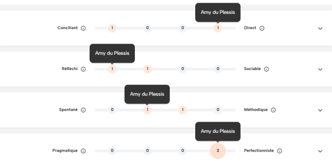 Pour en savoir plus sur les similitudes entre les profils des membres de l'équipe, sélectionnez la flèche déroulante à droite de chaque échelle afin de découvrir où se situent les résultats de chaque membre par rapport au profil de l'équipe. Passez la souris sur le nom d'un membre de l'équipe dans la section « Membres de l'équipe » pour voir où se situent exactement ses préférences au sein du profil global de l'équipe. Les noms des membres de l'équipe ayant des profils similaires sont regroupés pour chaque facteur.