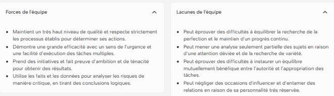 Les points forts et les lacunes de l'équipe sont répertoriés sous les échelles, tirés du profil comportemental global de l'équipe. Seuls les points forts et les lacunes les plus courants au sein de l'équipe seront affichés, en mettant l'accent sur les préférences comportementales partagées par la plupart des membres de l'équipe ou sur celles qui s'alignent étroitement.