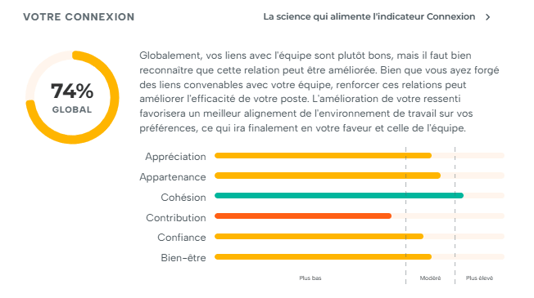 Les résultats mettent en évidence les domaines où la connexion est forte et ceux où elle doit être renforcée pour chaque facteur mesuré. Les individus ou les équipes obtiennent des informations claires et pratiques sur lesquelles ils peuvent agir immédiatement :