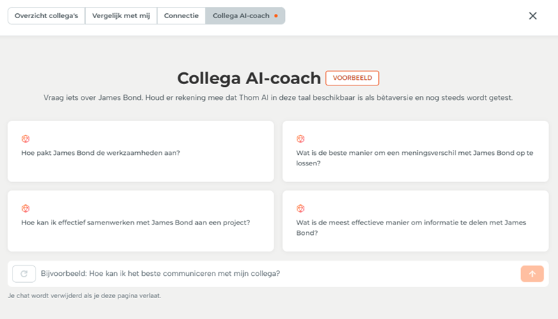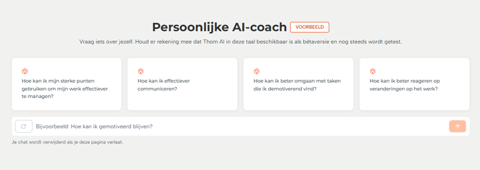 Onze Persoonlijke en Collegagerichte AI-coaches worden aangestuurd door Thom AI en leveren ondersteuning op maat, of je het platform nu gebruikt als niet-manager (collega) of als manager. Deze nieuwe functies vergroten het zelfbewustzijn, verbeteren de samenwerking met collega's en versterken de persoonlijke ontwikkeling en teamgroei.